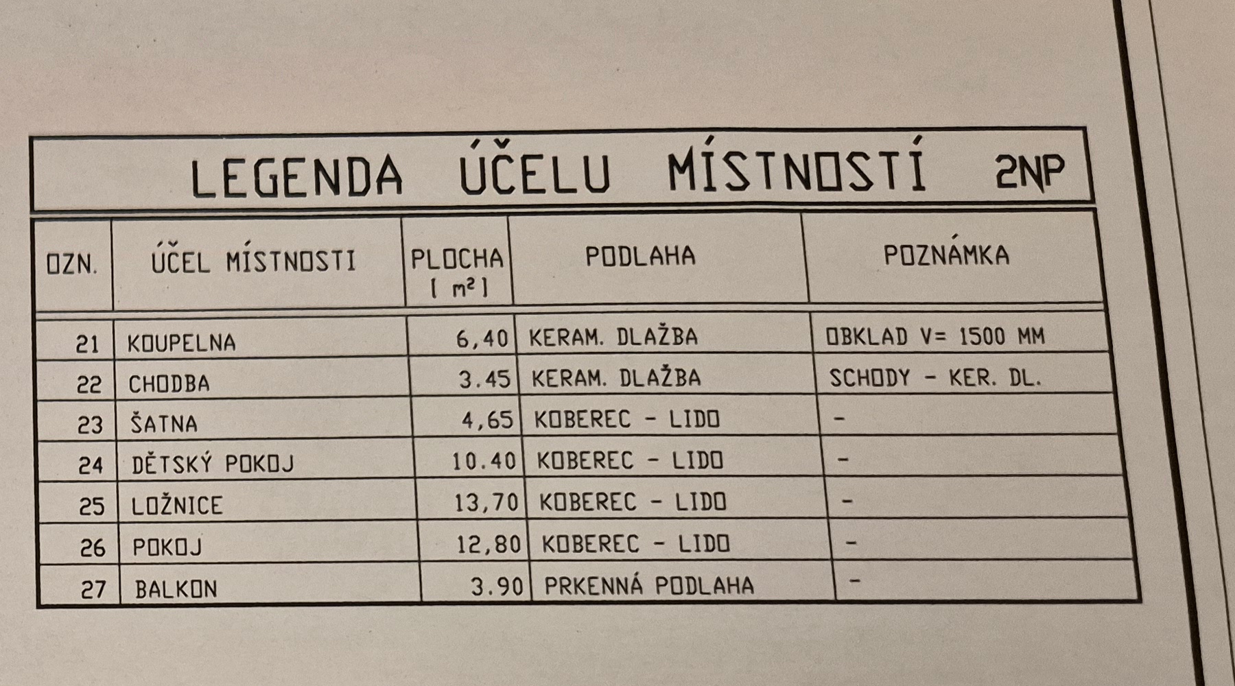 2 NP – koupelna 6,4 m2, chodba 3,45 m2, šatna 4,65 m2, 3 x ložnice 10,4 m2, 13,7 m2, 12,8 m2, balkon 3,9 m2.